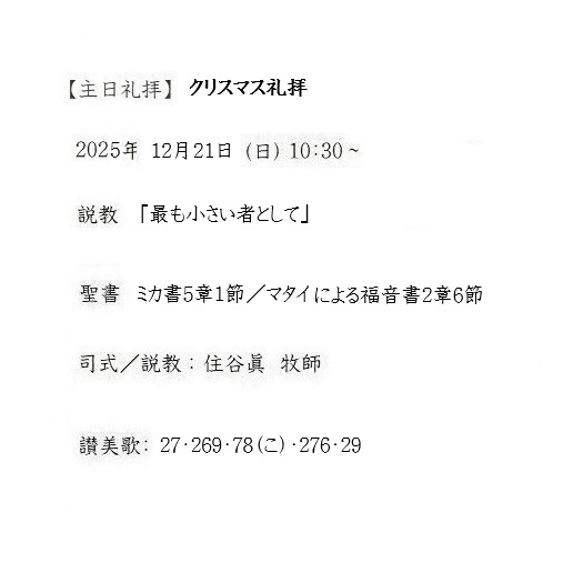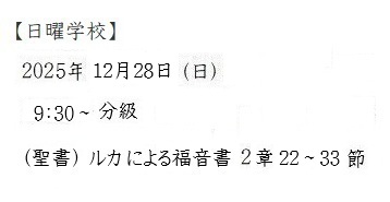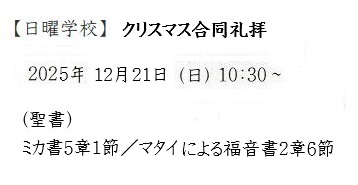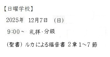 ◇クリスマス献金の袋を週報ボックスに入れました。主のご降誕を覚えてお献げください。